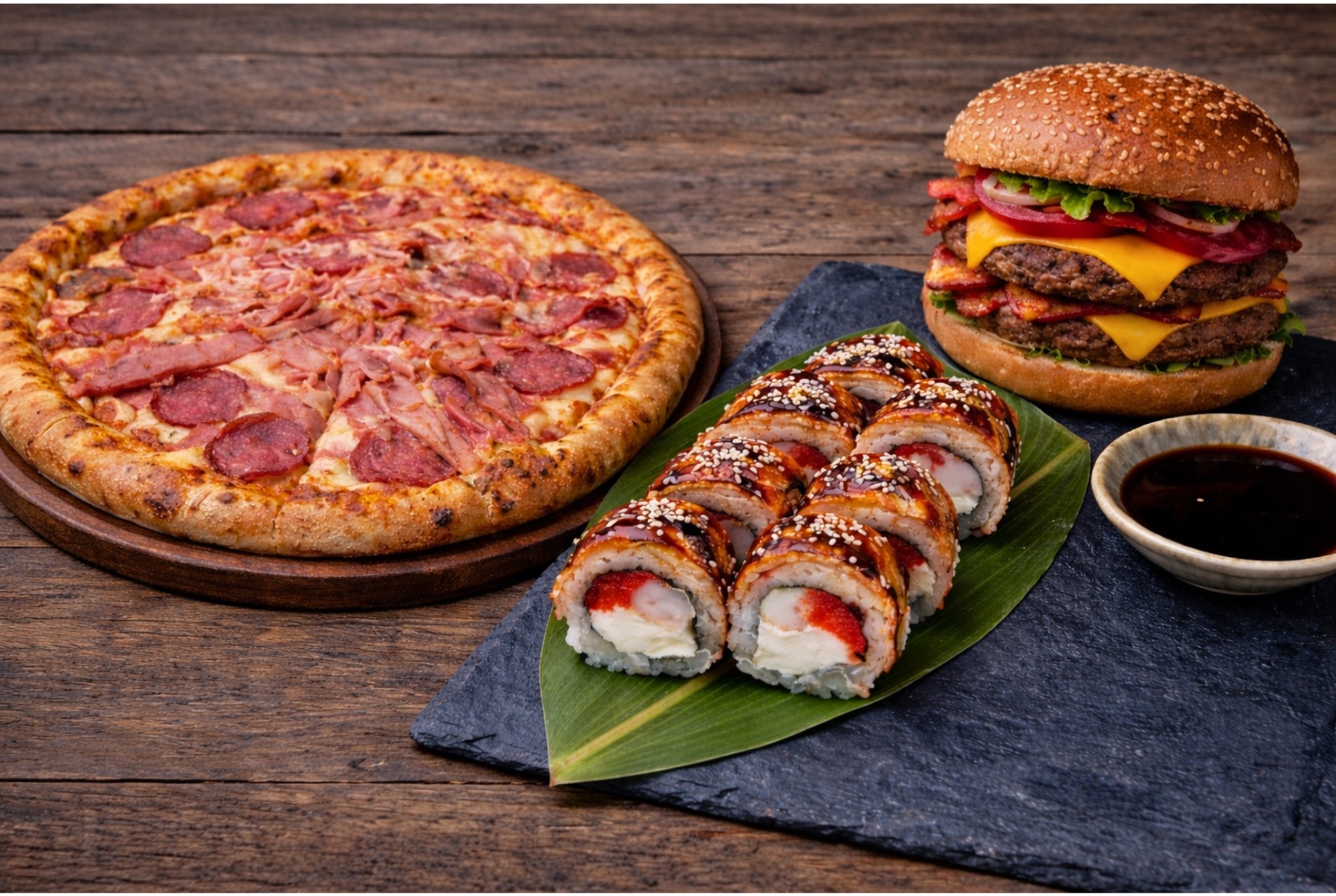 Witamy w miejscu, gdzie spotykają się trzy kulinarne światy: aromatyczna pizza, wyrafinowane sushi i innowacyjne burgery z sushi! 🍕🍣🍔
